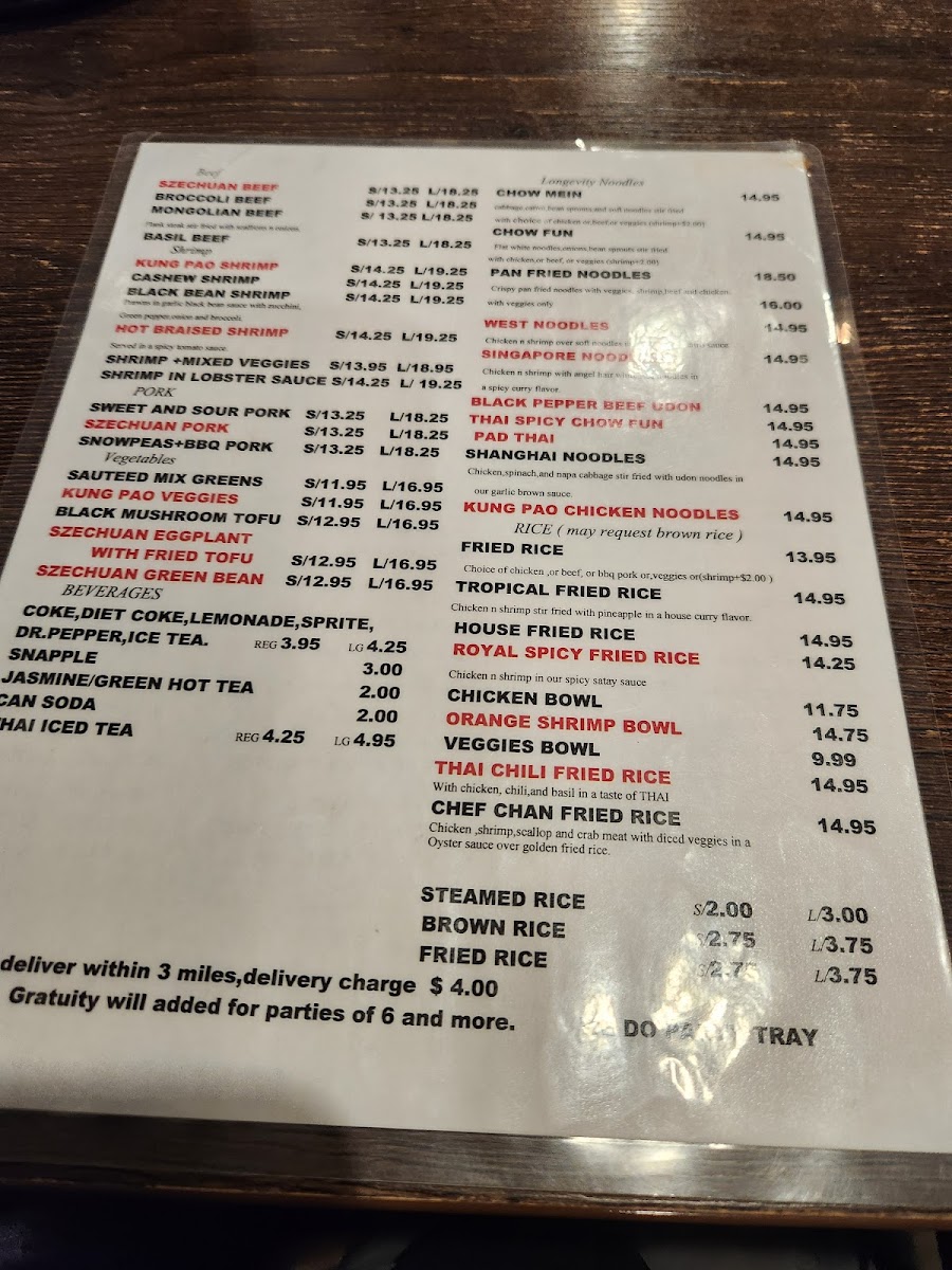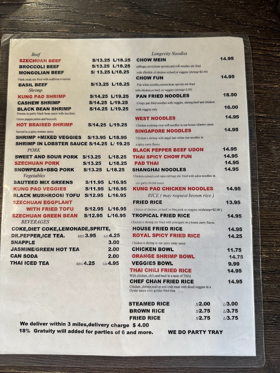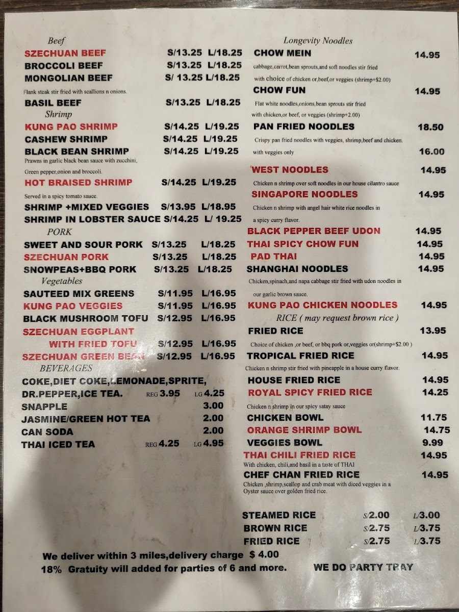 Beverages on the menu include canned soft drinks such as Dr. Pepper, Coke, and Diet Coke, as well as specialty drinks like Thai Iced Tea and China Mist Iced Tea, providing both sweetened and unsweetened iced tea options. Snapples are also available, offering flavored iced tea varieties.